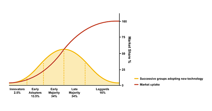 Der Soziologe Everett M. Rogers teilt dabei die Menschheit in fünf Gruppen, von den Innovators, den ersten 2,5% der Menschheit, die eine Innovation adoptieren, bis hin zu den Laggards ("Nachzüglern"), den letzten 16% der Menschheit, die die Innovation annehmen. (Quelle)